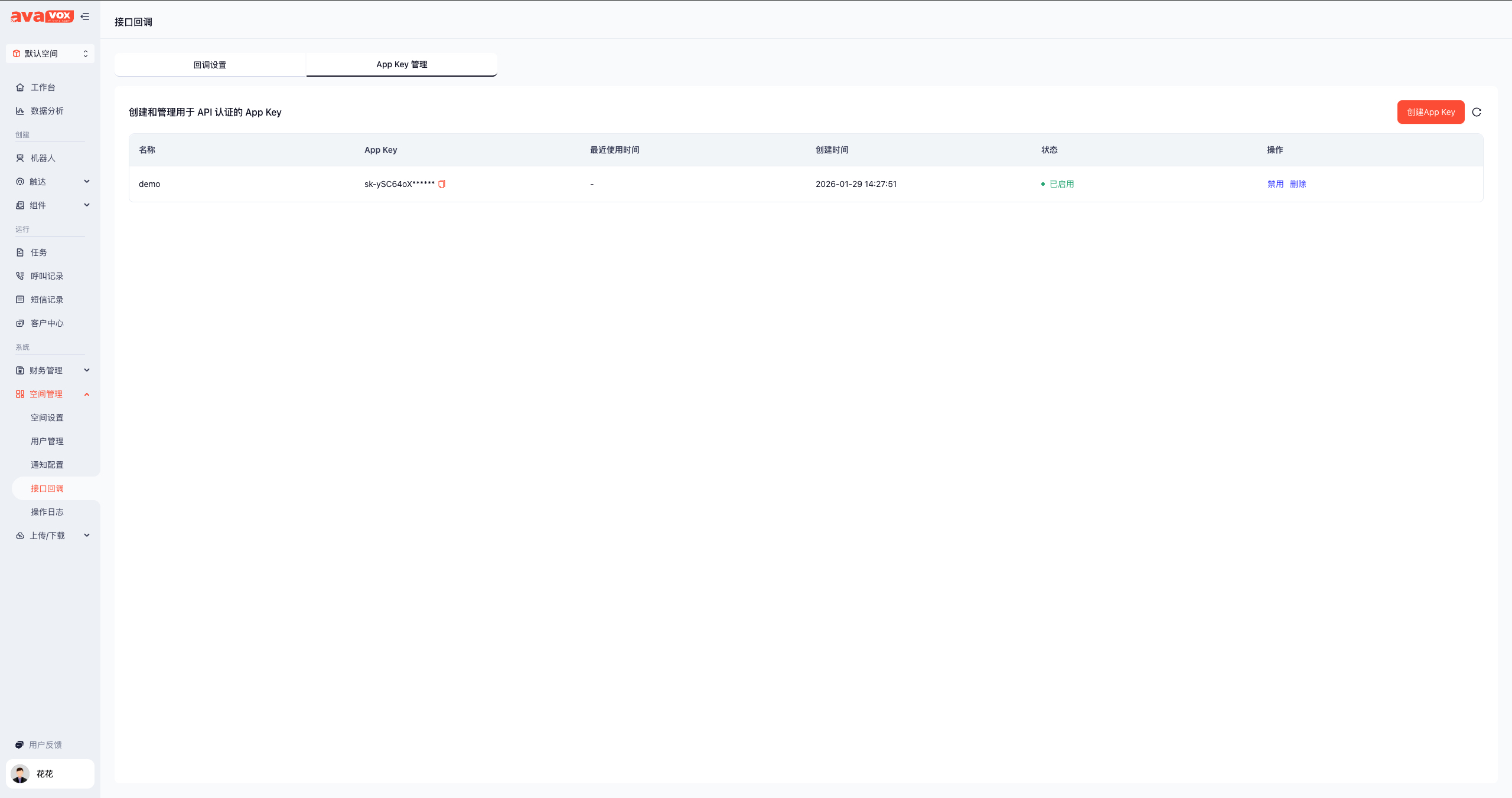 空间管理 → 接口回调 → App Key 管理