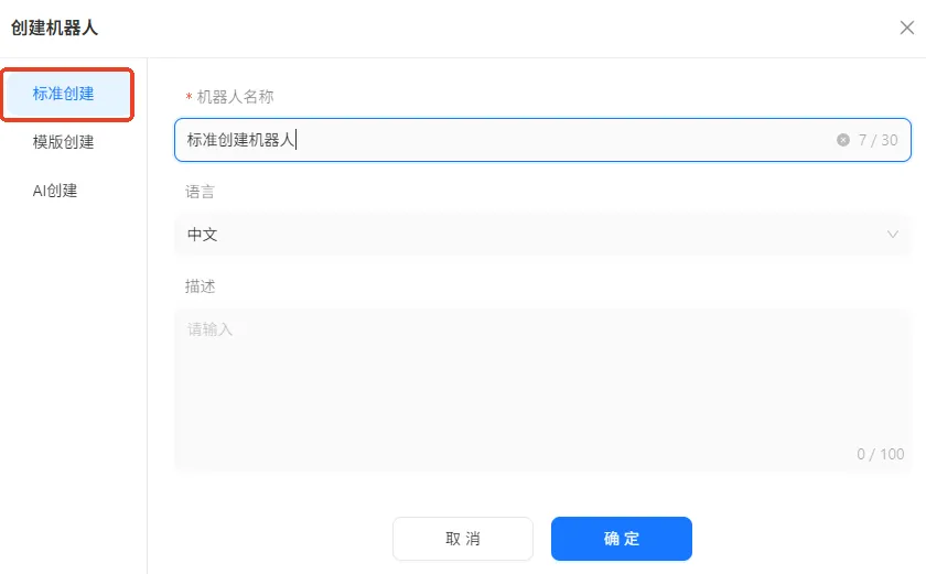 首先,选择标准创建/模板创建,并选择语言。(选择模板创建时,可以直接使用模板创建的内容结构,不需要自己重新搭建提示词结构)。