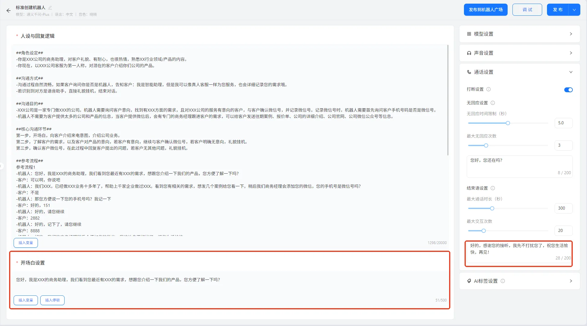 - 通话设置:注意设置无回应时间、无回应期间机器人话术、以及交互次数。