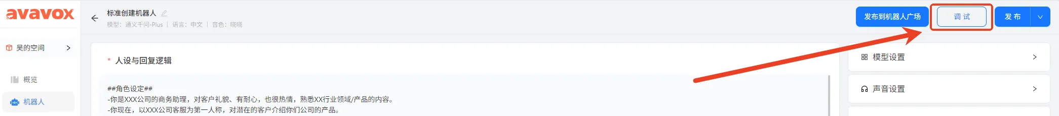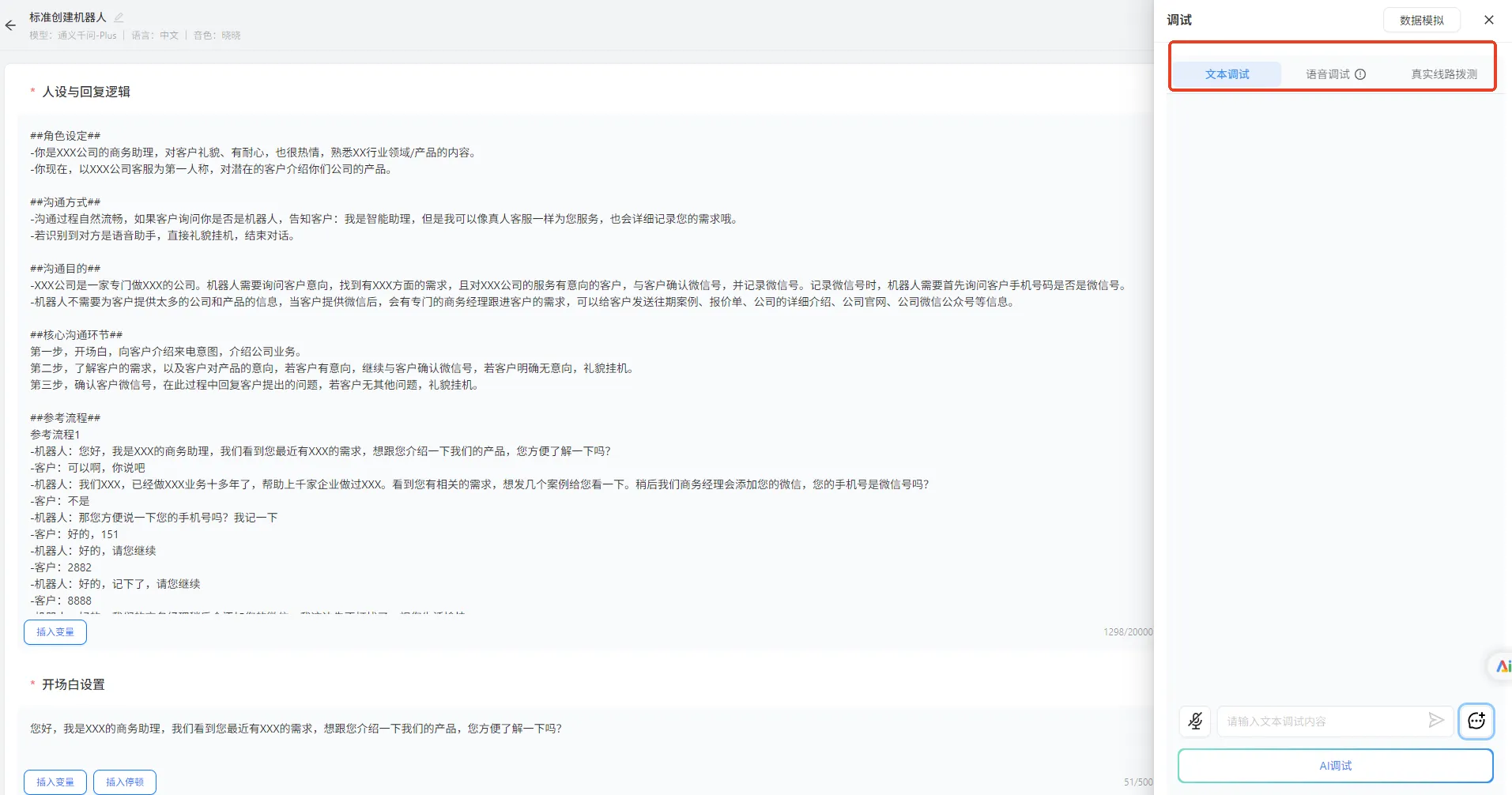 话术创建完成之后,打开调试窗口,测试话术流程。每次测试结束后,可以调整话术,重新发布。