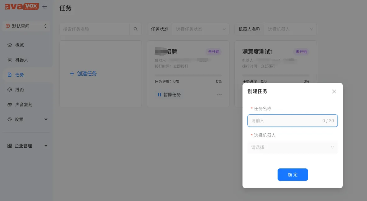 输入任务名称、选择对应的机器人,点击确定,进入任务详情页面;