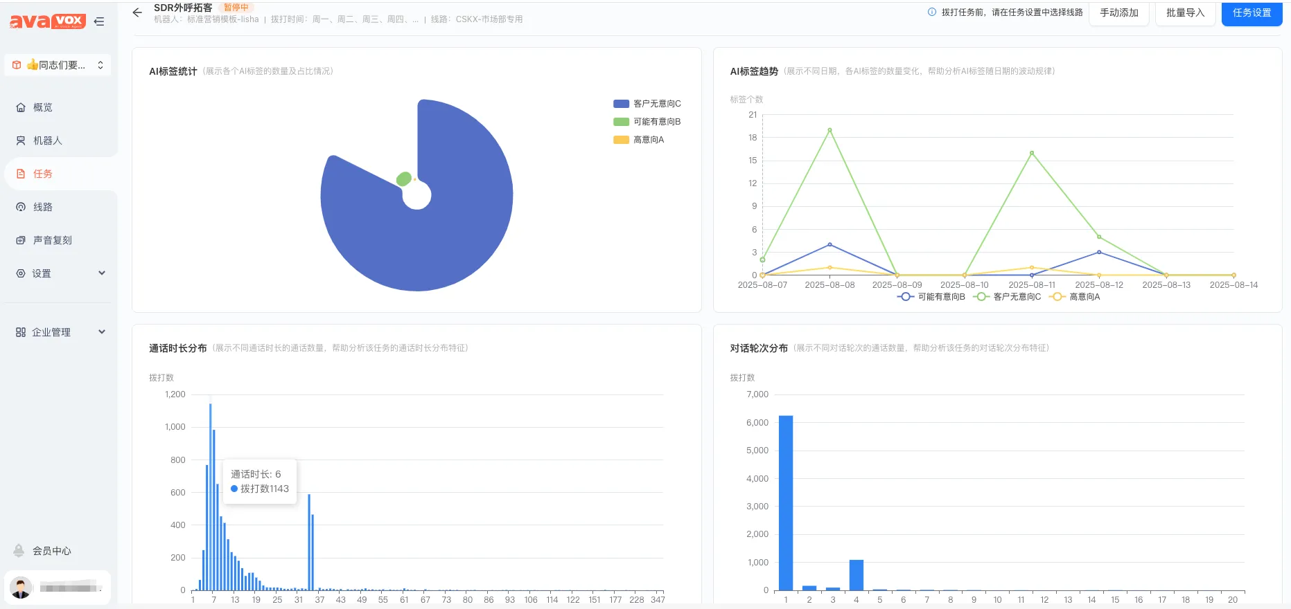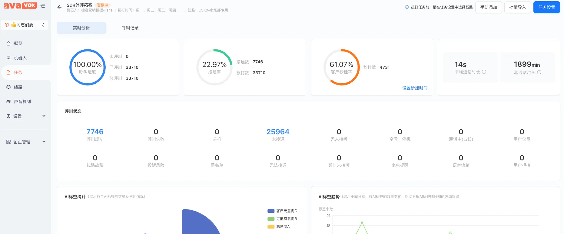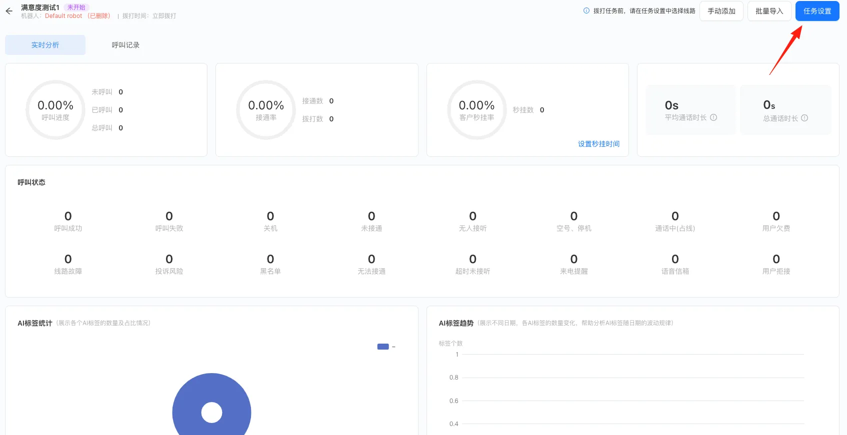 在任务列表页面,点击实时分析,即可查看任务的实时数据,包括任务的完成情况,接通情况等等