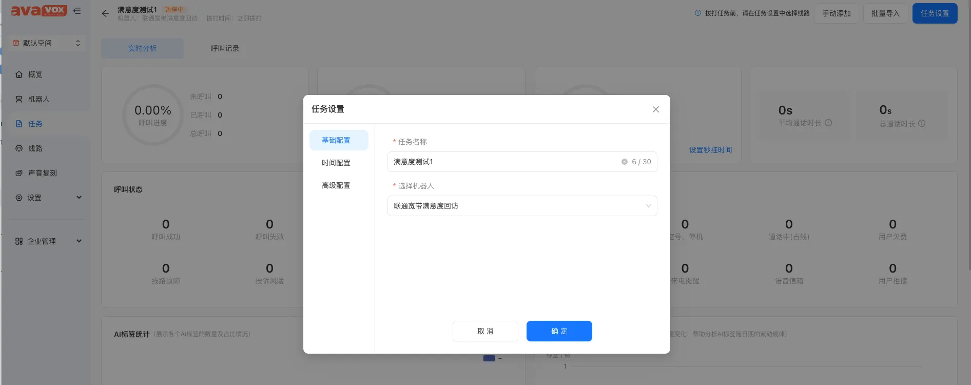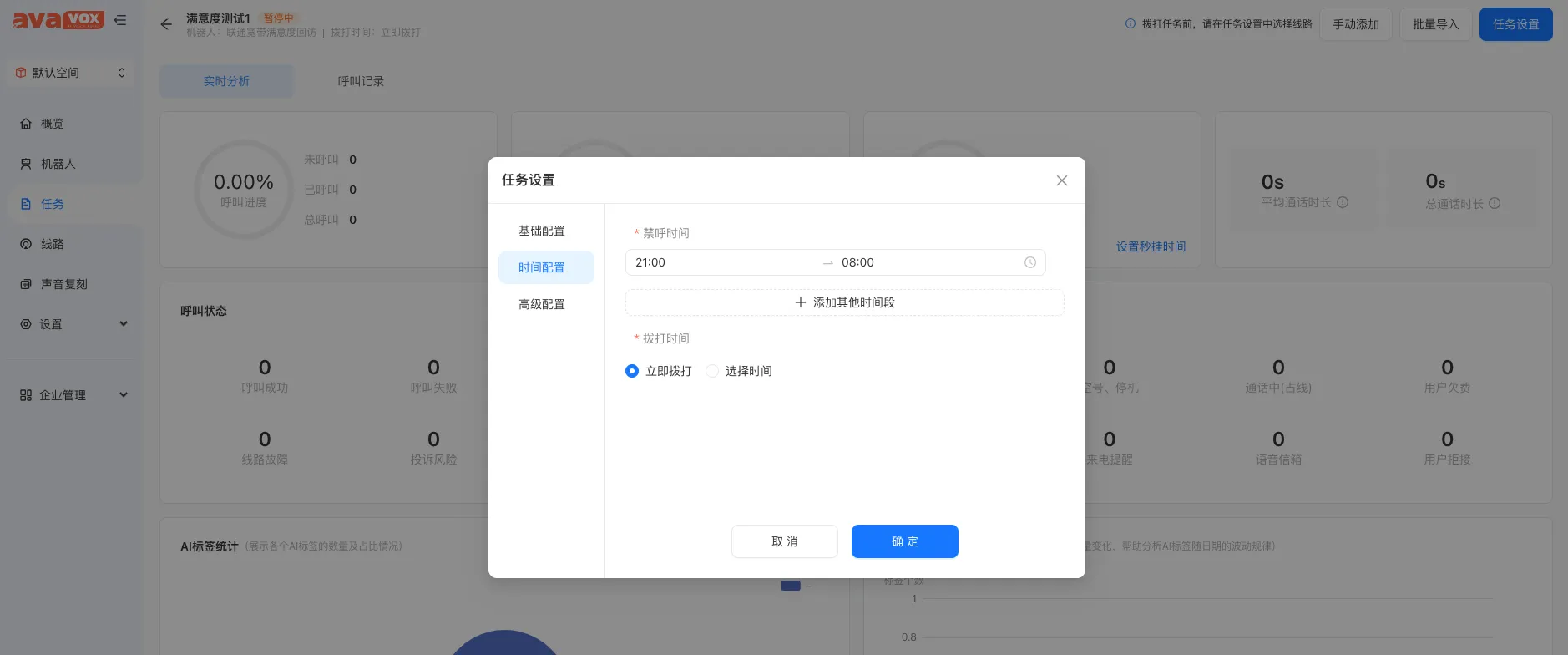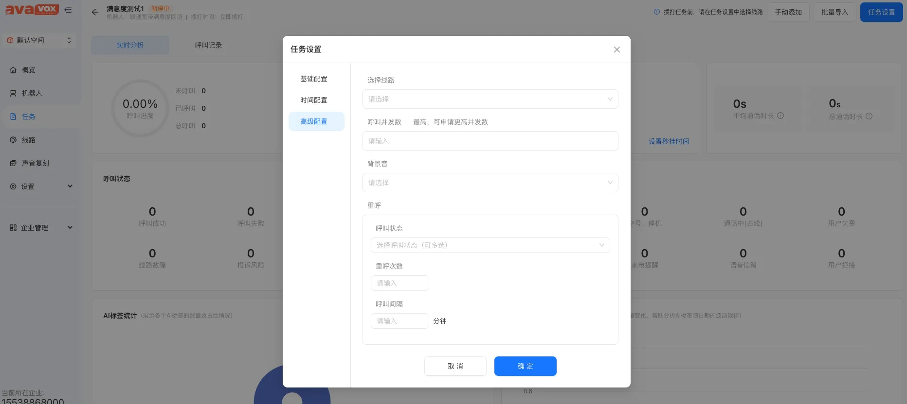 在这里管理任务的拨打时间,线路,并发数,背景音,重呼等,如果不需要修改,可以不设置。