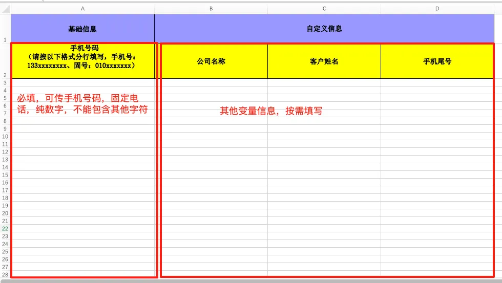 第一列为手机号码,必填,必须填写手机号码或者固定电话,纯数字,不能包含其他字符,一行一个