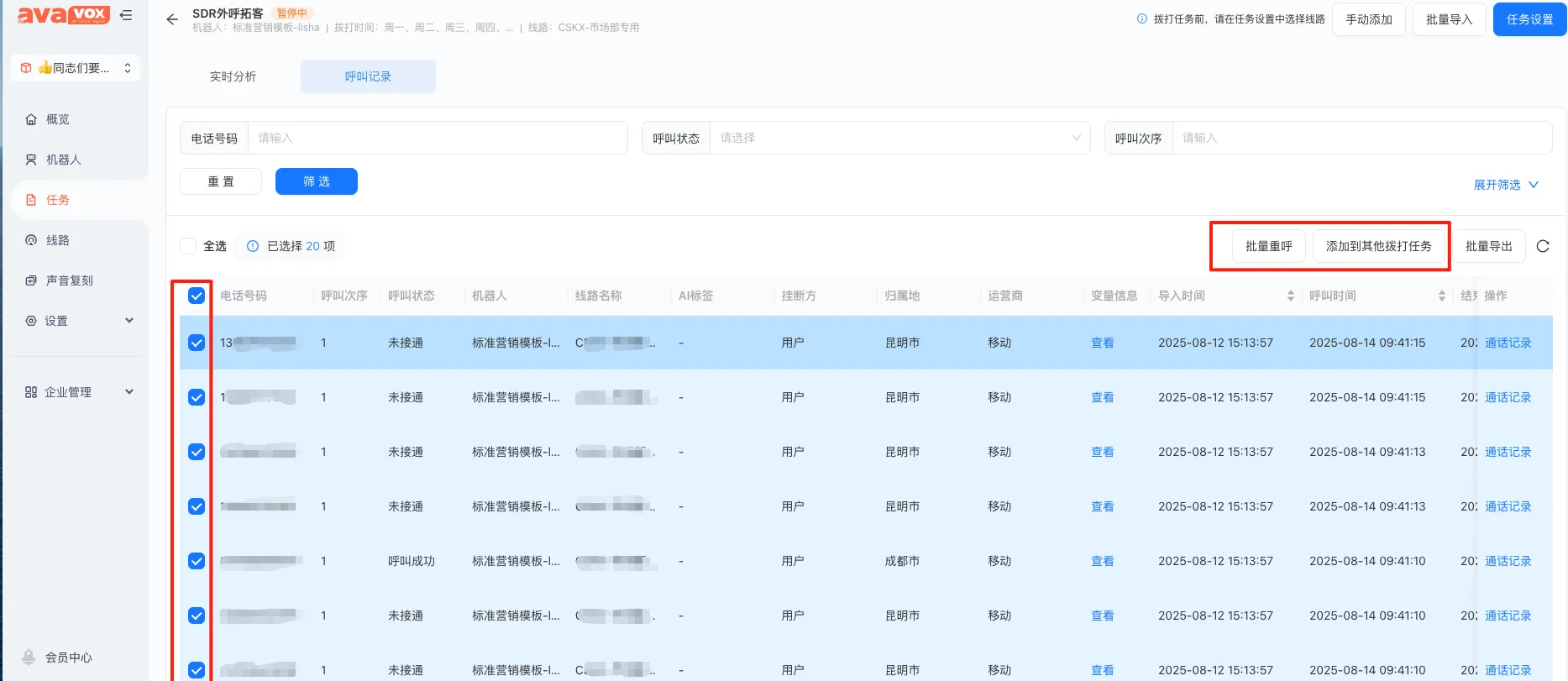 - 批量重呼:在任务详情页中勾选需要重新外呼的号码,点击批量重呼按钮,将在当前任务中执行批量重呼操作;