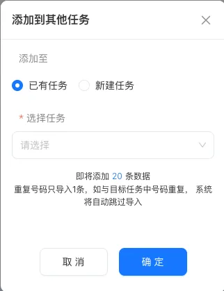 - 添加到其他拨打任务:在任务详情页中勾选需要重新外呼的号码,点击添加到其他拨打任务按钮,可选择已创建的任务或新建任务号码导入,执行批量重呼操作;