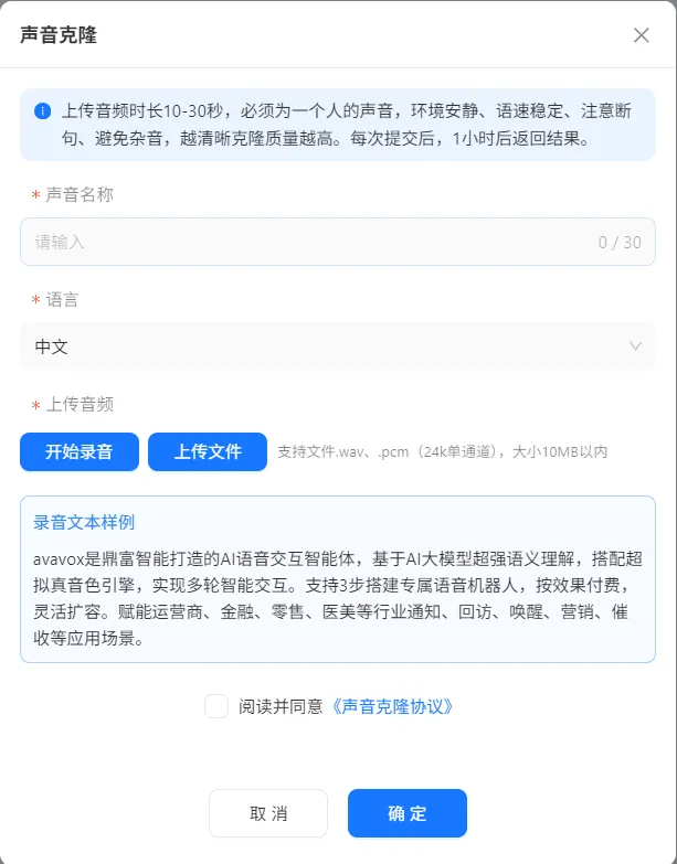 输入声音名称,在安静环境下录音。录音使用的文本内容不限,可以自定义文本,或直接使用样例文本。录音上传后,需要等待 1 小时左右完成训练。