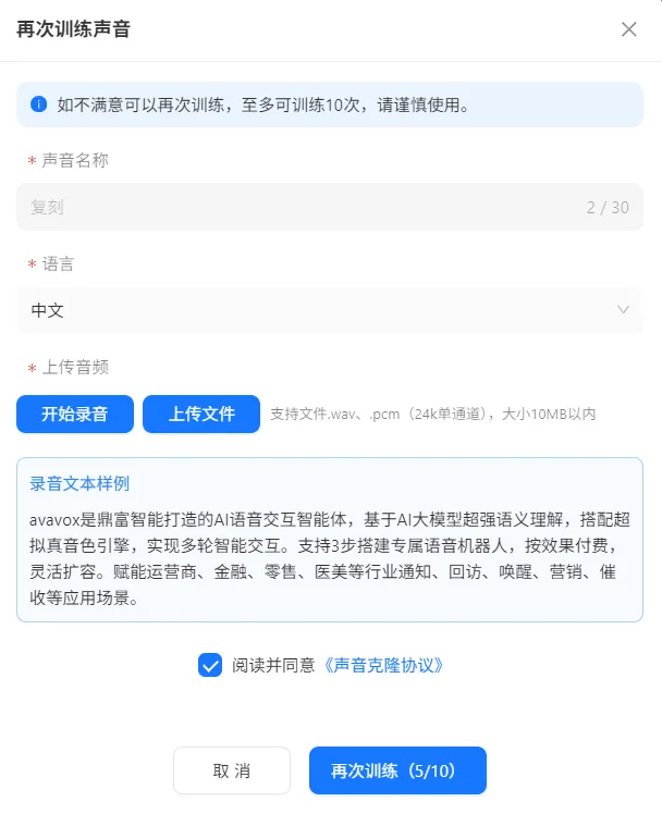 系统支持您再次训练声音,有 10 次训练的机会,录音后,同样需要 1 小时左右完成训练。