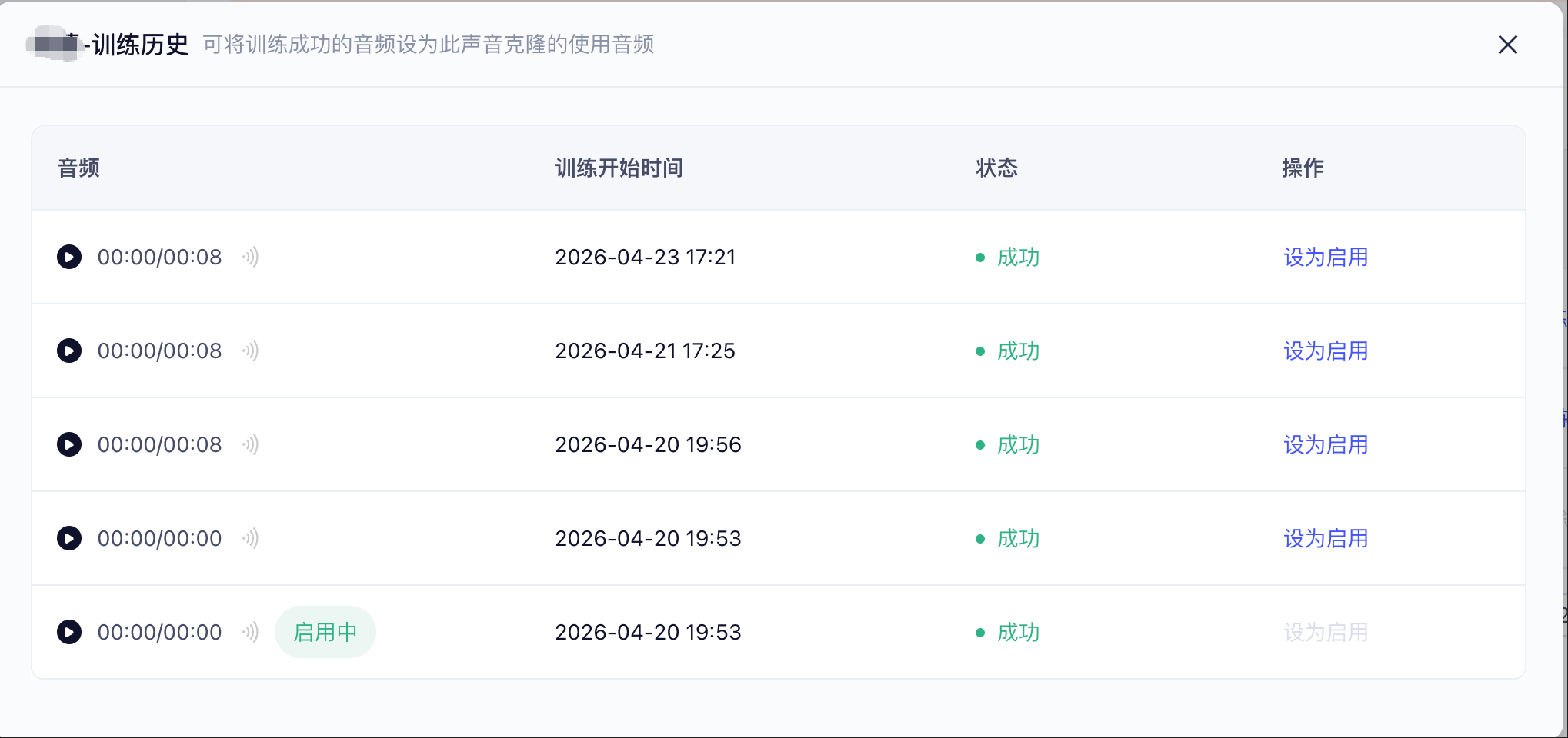 - 每次最新的成功训练记录将默认作为启用中音频,用户可在训练历史中指定其他历史记录作为启用中音频。